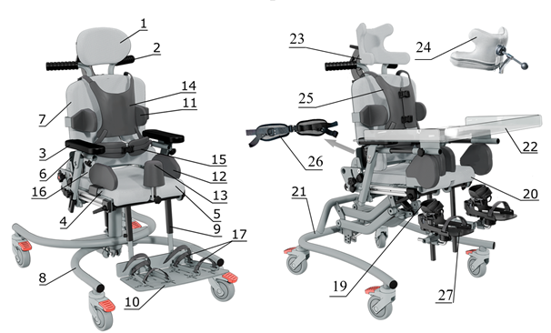 Шасси комнатное пневматическое Х-образное размер 4(8), анатомический подголовник (26), сиденье с абдукцией каждой ноги (27), подножка с раздельной платформой для стоп и упором для пятки-(28)-2 шт., 4-х точечный тазовый ремень(15),жилет(14), подлокотники (регулируемые по высоте и углу наклона-3), держатели голени(24), ручка для сопровождающего(2), ,спинка, сиденье, подушка для спинки(7), подушка на сиденье(5), боковые опоры для тела 2 шт.(11) , боковые опоры для бедер 2 шт.(12), стол(22), поясничный валик(16), фиксации стоп(17)