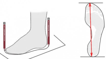 Под углом 90 градусов, лучше стоя, измерить длину стопы от пятки до большого пальца.