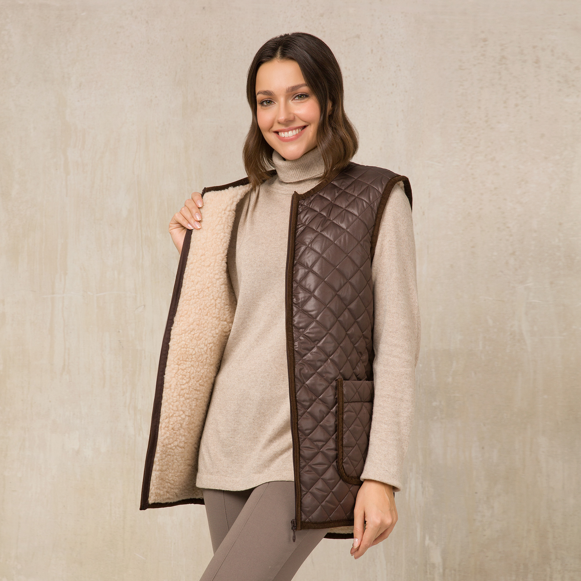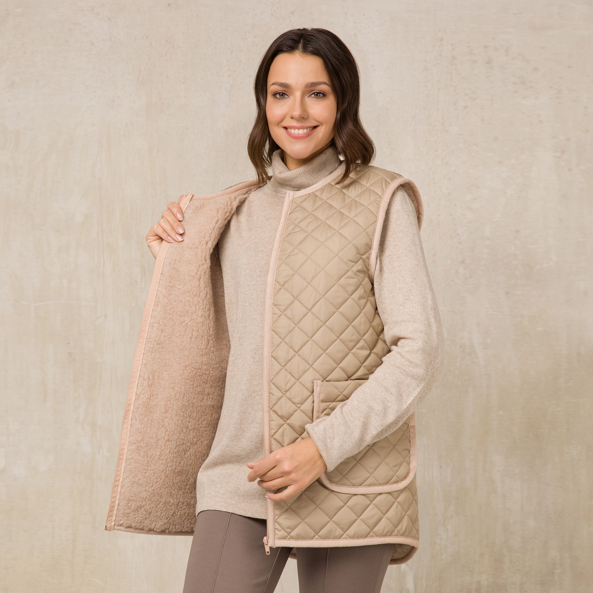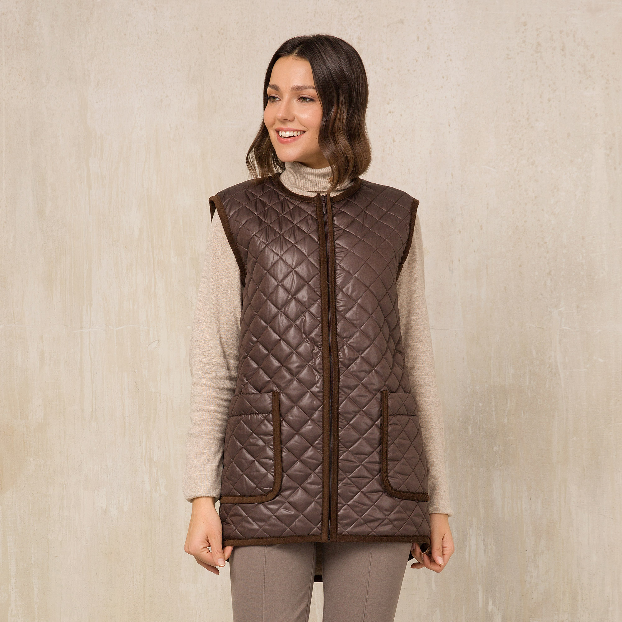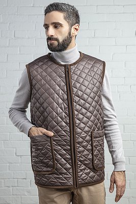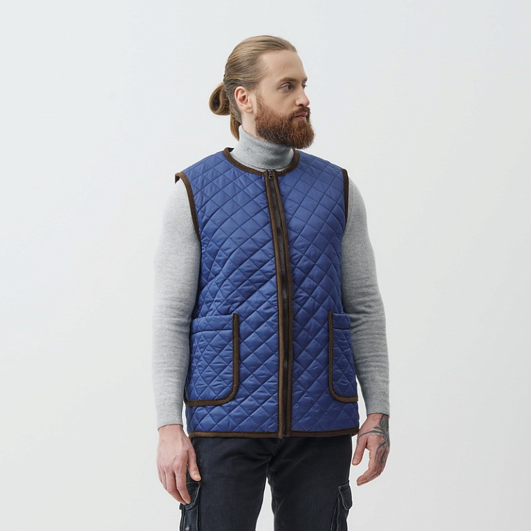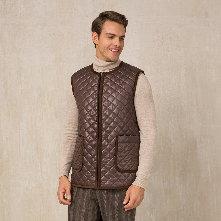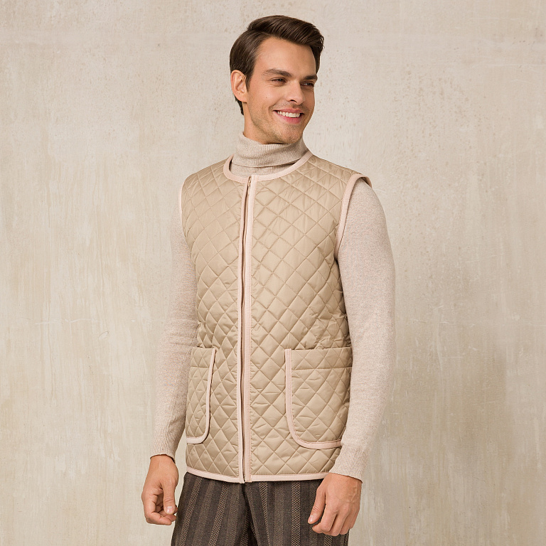 Универсальный жилет прямого силуэта из плащевой стеганой ткани. Подкладка - трикотажное полотно с чистошерстяным ворсом.